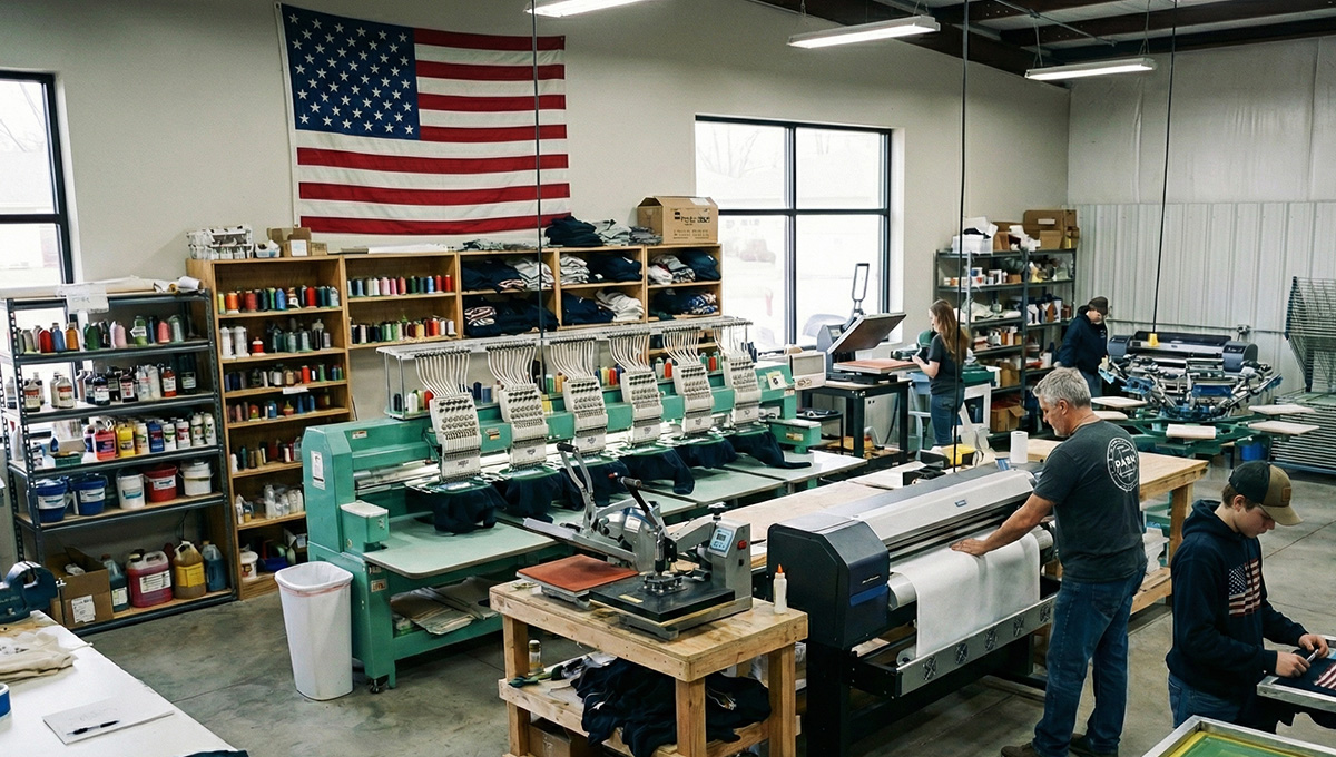 American worker embroidering patriotic apparel in a U.S. workshop, representing why American manufacturing still matters