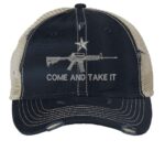 Our weathered hat combines traditional military styling with powerful Second Amendment messaging. The structured front panel prominently displays the embroidered AR-15 and “Come and Take It” text with distressed detailing, while the breathable mesh back provides excellent ventilation. The adjustable strapback closure with metal hardware accommodates various head sizes while adding to the authentic military aesthetic that defines this 2nd Amendment hat.