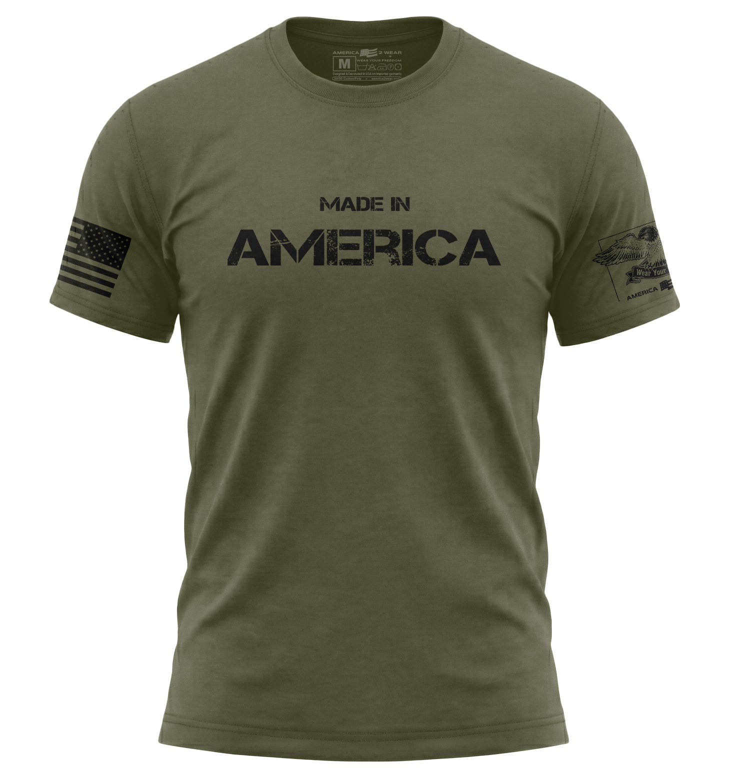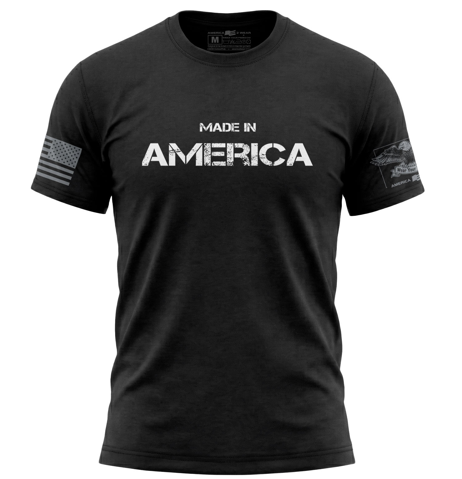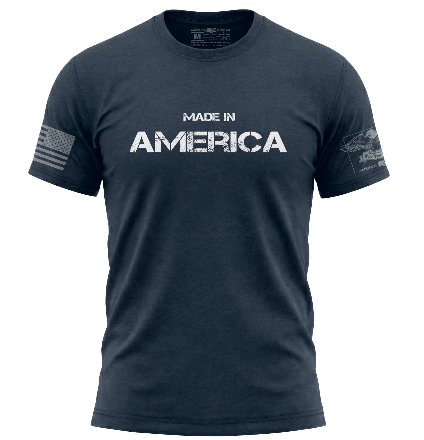 Represent the heart of the USA with the Made in America T-Shirt. This premium 50/50 blend tee features a bold 11-inch wide printed 'Made in America' graphic, celebrating the legacy of American industry and pride.