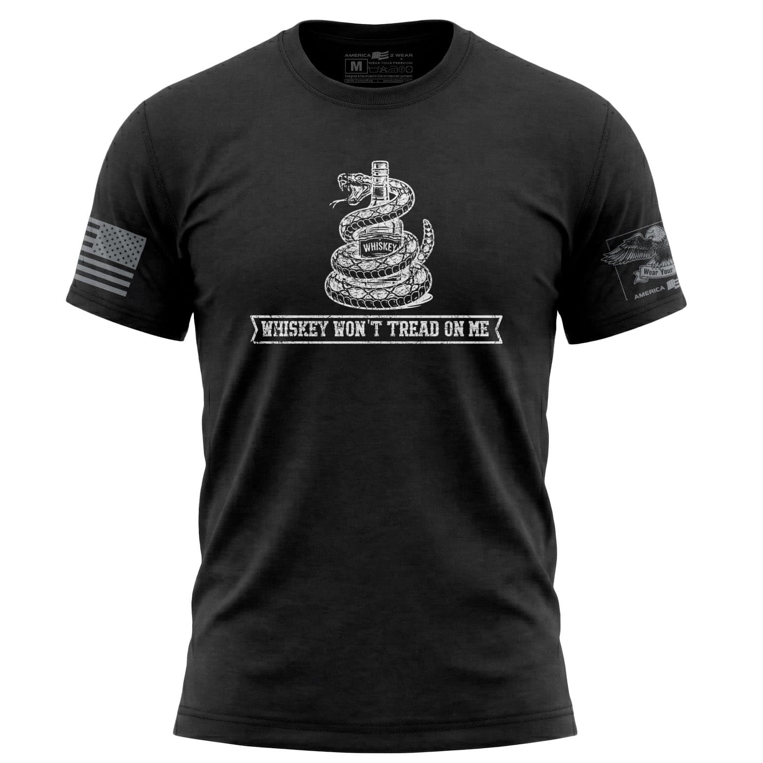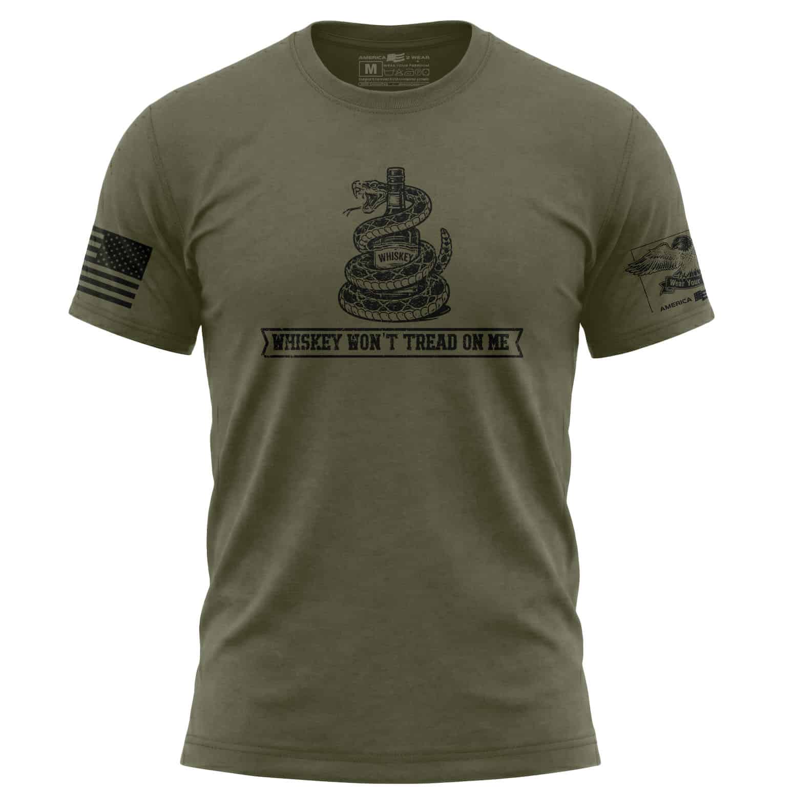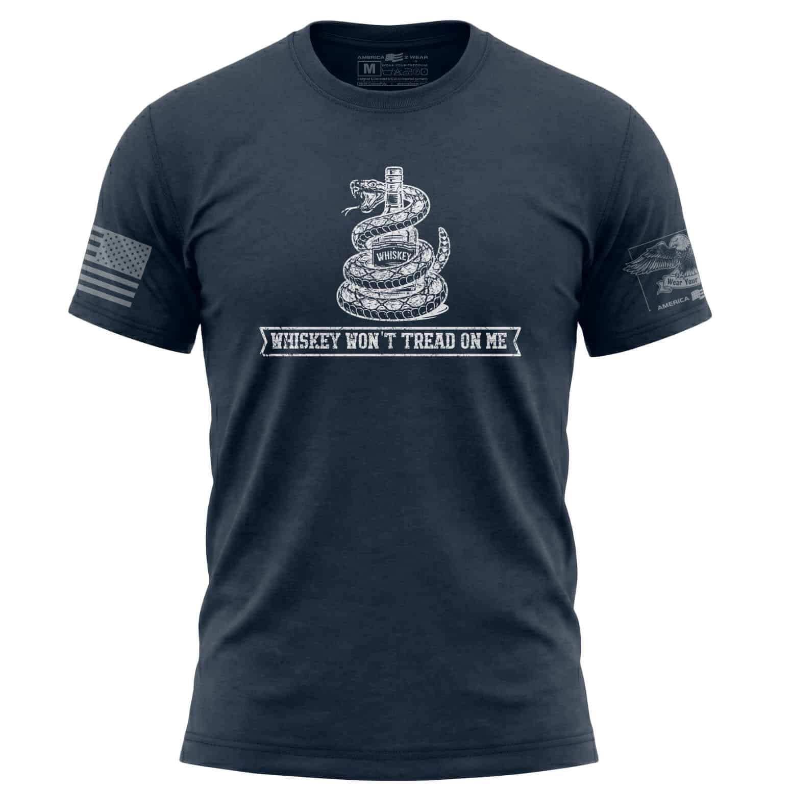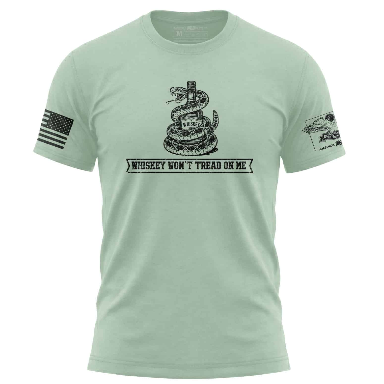 The Whiskey Won’t Tread On Me T-Shirt takes a classic defiant spirit and gives it a whiskey-soaked edge. With a snake wrapped around a bottle and the line Whiskey Won’t Tread On Me underneath, this distressed front graphic lands somewhere between rebellion, humor, and unapologetic American attitude. That is exactly the point.